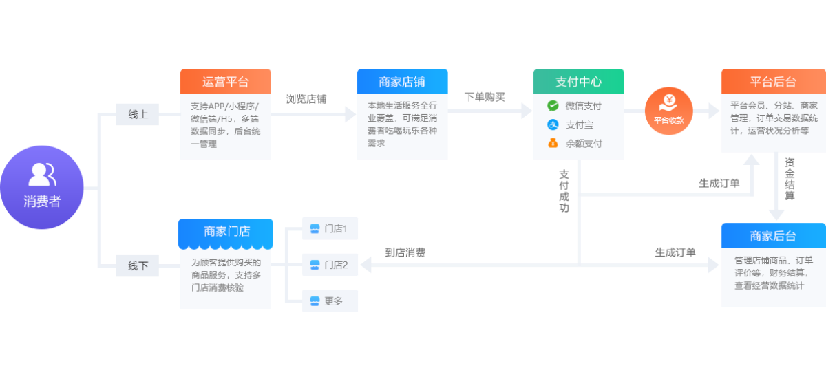 适用于本地多行业商家入驻,商家通过平台展示门店信息,发布团购商品, 用户在线下单购买,线下到店消费,线上线下相互导流,解决商家销售难题