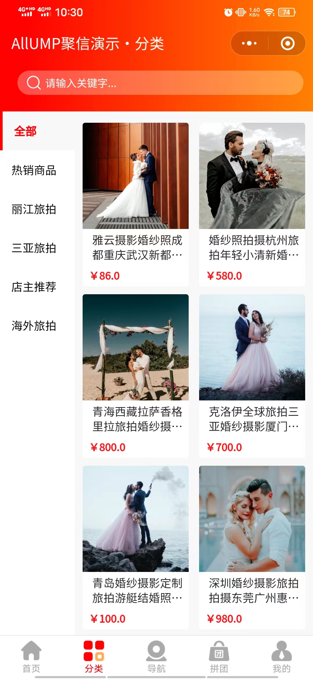 商城分类:可以让用户更加方便地浏览和购买婚纱摄影相关的产品和服务。比如,商城分类可以按照拍摄套餐、婚纱礼服、摄影器材等分类,让用户更加轻松地找到自己需要的产品和服务。