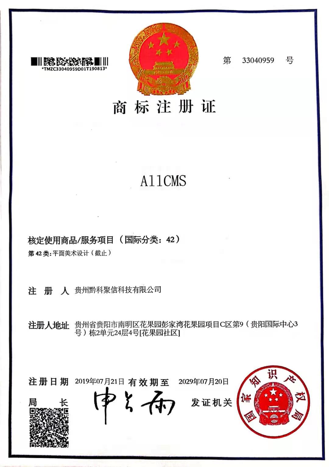 热烈祝贺贵州黔科聚信科技有限公司申请注册的“allcms”和“all”图形商标,获得中华人民共和国国家工商行政管理总局商标局核准注册成功。